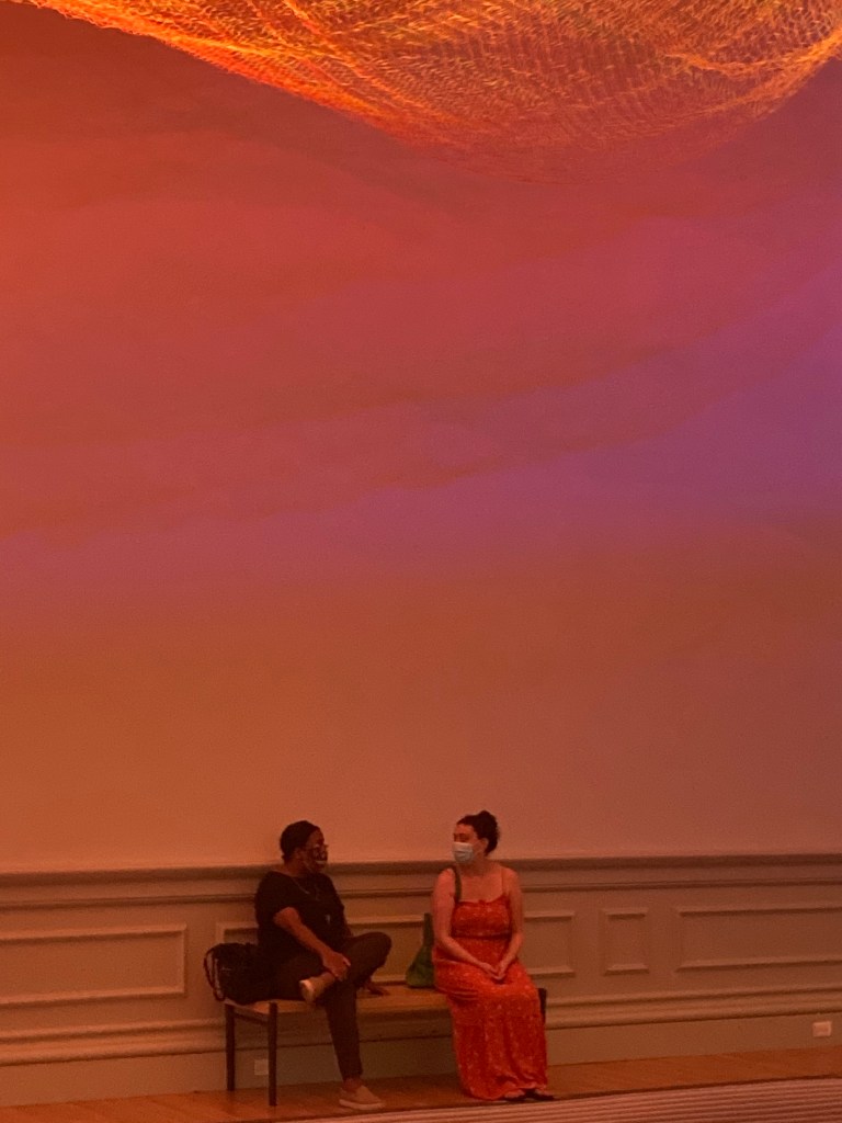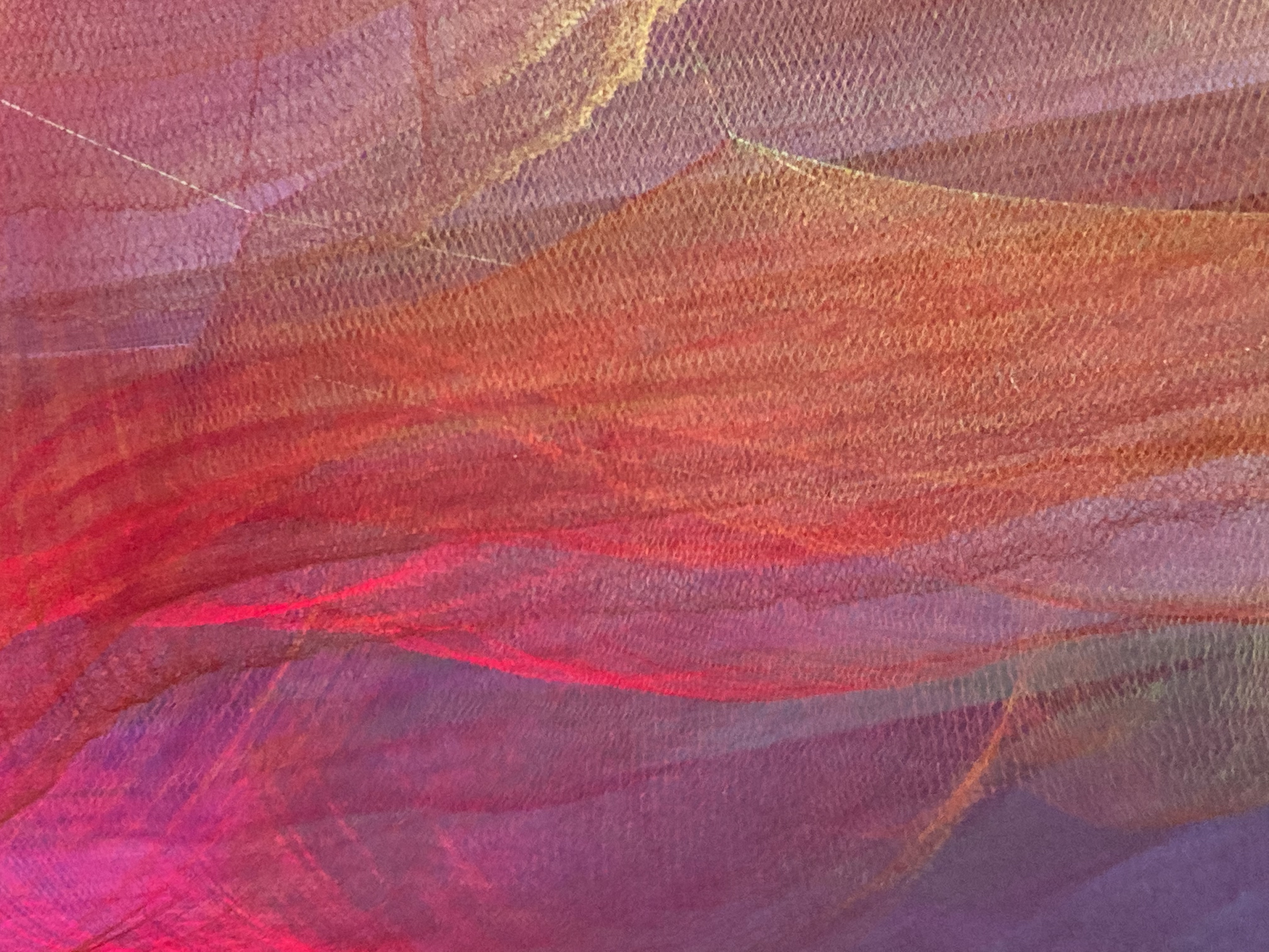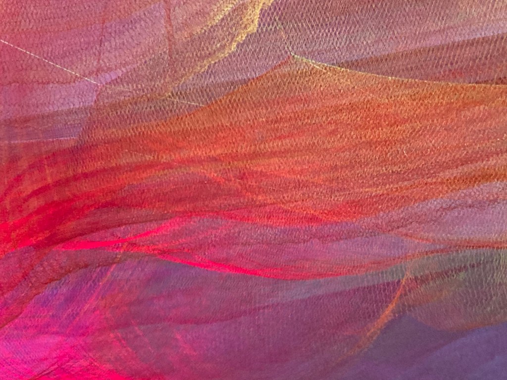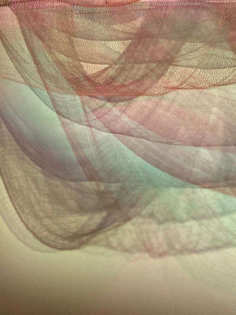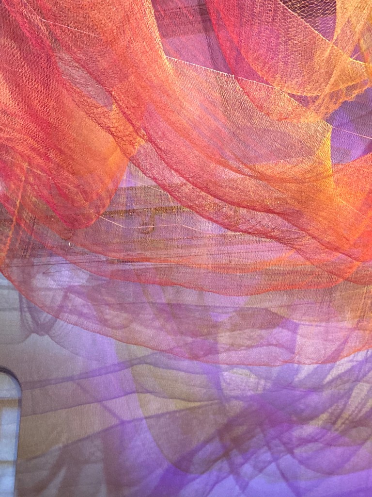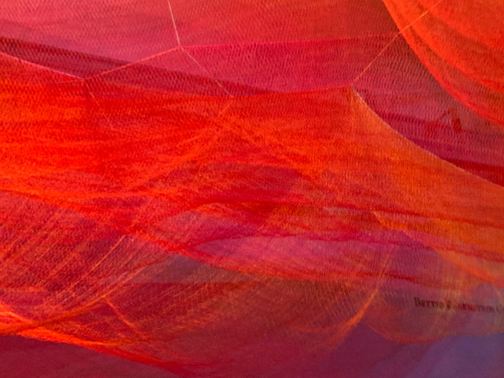 On a recent visit to the Renwick Gallery I wandered through the enormous room displaying Janet Echelman‘s Renwick 1.8 art piece. Gargantuan fabric nets draped across the vaulted ceiling and hung in giant latticed ladles drooping in transparent overlapping layers of vibrant, ever-changing colors. The description on the wall states, the art piece is Echelman’s way of examining the “complex interconnections between humankind and our physical world, and reveals the artist’s fascination with the measurement of time.” The piece was “inspired by the 2011 Tohuku earthquake and tsunami…The lines on the carpet trace the topographic patterns of the three dimensional form above.” Whether standing in the middle of the room or circling the room’s edges, I felt both grounded and suspended at the same time–alternately shifting between the earth’s surface and under the sea or, as the colors in the room changed, drifting over the earth and through waves of sunlight.