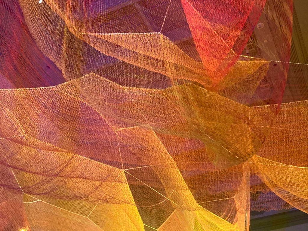 In our every day world, we move through time responding to needs and concerns, following rings of repeated activity and the topographical patterns outlining the shape of our culture and the ground we build our lives on. Moving between and within waves of sound, light and energy, we live and walk inside layers of physical wonder. As in Echelman’s dangling nets bathed in light, everything in the physical world steeps in a spectrum of moods, actions and reactions, our own, as well as that of the world around us. Eichelman’s piece allows viewers to observe and experience a relationship between physical form, light and energy. As the folds and shadows in the layers of nets suggest, there is a lot of subtleties and mystery in what we experience as well.