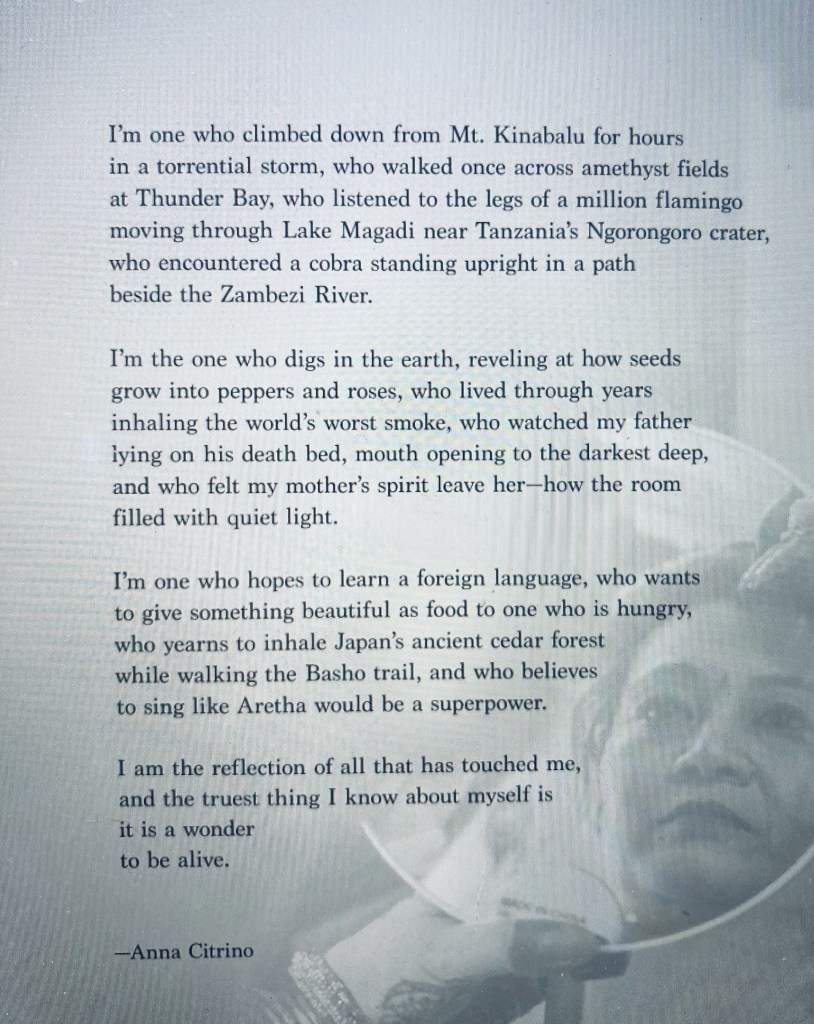 Whether traveling to a foreign country or to a different part of our own city, moving beyond the borders of familiarity to encounter ways of thinking and interacting different from our own can help us to see ourselves more clearly, gain a vision for how we might discover our interconnectedness to other lives, and to discover an energy that helps us imagine a larger, more caring and inclusive world to participate in and nurture. This coming year, I want to expand my heart and vision further. I want to live in a world where I see the radiance in others I encounter, am a mirror of their brightness, where I my heart is open to a world that is full of wonders. As Rumi has written, “I wish I could show you when you are lonely or in darkness the astonishing light of your own being.” Here is my song for you in this liminal space between the ending of this year and the start of the next. Barbara McAfee