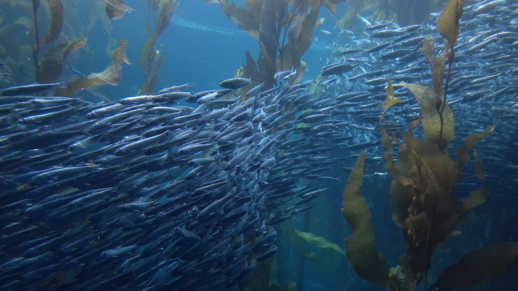 Standing before the glass at the Monterey Bay Aquarium, I watched as sardines swirled in graceful, ribboned unison, turning then splitting into two shifting forms, as over and again a hammerhead shark pierced through their fluid movement. To observe life under the sea’s surface is to enter another world that is our own but utterly different, and is perhaps the most otherworldly experience one might have. While staring at the fish, on one hand, a person could say that nothing much is happening: over and over one large fish chases other smaller ones. But from another view, the most essential thing is happening: you are observing life in all its mystery and it leaves you standing in awe. For a few moments you’re unaware of anything but the fishes’ movement as they glide as if in dance through the liquid blue, and you step into some larger universe where time dissolves.