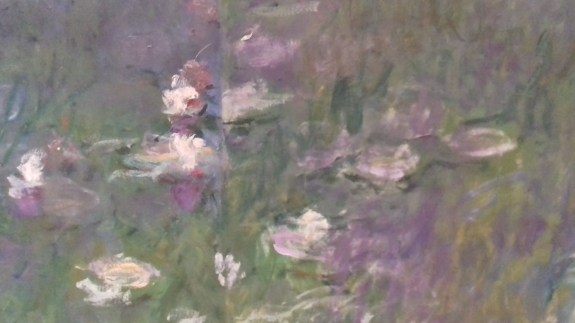 Taking ideas from Japanese woodblocks, and with his children’s help, Monet created the garden at Giverny. He shaped the garden and the landscape, digging the ponds, putting in the Japanese bridge, and mixing common flowers with exotics, then painted the landscape and light. Dusty mauves, purples and muted blues–the color tones on the canvases in the l’Orangerie instill a feeling of calm. From the wide stretches of water textured with color, waterlilies appear in buds of illumination floating on spacious planes of reflection. Gardens filled with light and waterlilies–Monet painted the opposite of anxiety.